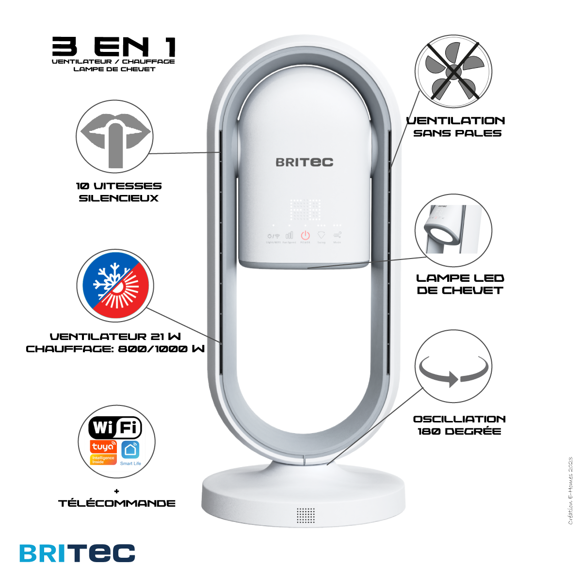 Bien plus qu’un Chauffage, 3 en 1, AIR HEAT3 WiFi BRITEC est aussi Ventilateur, Chauffage, Lampe de nouvelle génération sans pale, très silencieux.