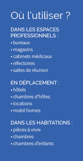 A la maison, au travail ou en déplacement, adoptez-le, en complément des consignes sanitaires en vigueur, pour une protection renforcée et  un air sain dans votre environnement.